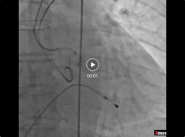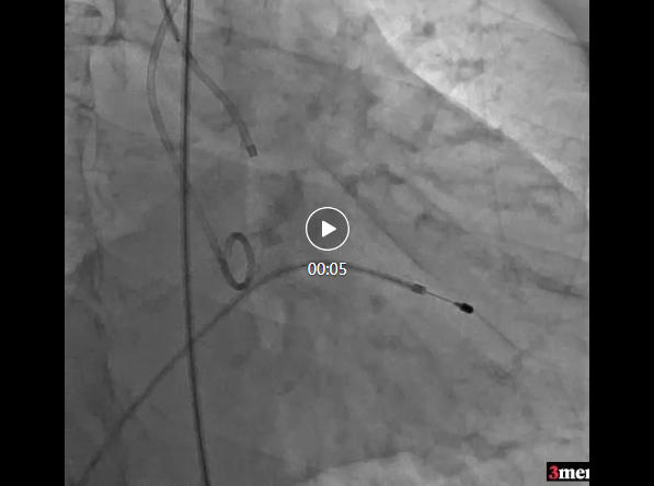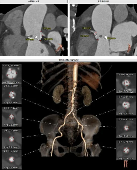 患者為功能性二葉瓣,瓣葉增厚,輕度鈣化,鈣化主要集中在左竇瓣葉上,左冠脈高度較低,結(jié)合瓣葉長度,竇部結(jié)構(gòu)綜合評(píng)估左冠風(fēng)險(xiǎn)較低,但左冠瓣葉瓣尖處有鈣化團(tuán)塊,在球擴(kuò)以及瓣膜釋放時(shí)仍需注意左冠灌注情況,由于鈣化團(tuán)塊位置特殊,建議做冠脈保護(hù)處理,右側(cè)股動(dòng)脈作為主入路,穿刺點(diǎn)位于股骨頭中段即可。
