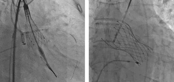 采取局麻+鎮(zhèn)靜麻醉方式,避免氣管插管對(duì)循環(huán)打擊;預(yù)裝VenusA L26瓣膜,患者心功能較差不進(jìn)行球囊預(yù)擴(kuò)張,直接放瓣膜;升主動(dòng)脈稍寬,注意器械通過,必要時(shí)snare輔助;建議行左冠保護(hù);右股動(dòng)脈作為主入路。