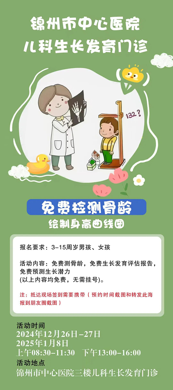 2025年1月8日將再次開(kāi)展骨齡義診活動(dòng),報(bào)名要求:3歲以上兒童。地點(diǎn):錦州市中心醫(yī)院三樓兒童生長(zhǎng)發(fā)育門(mén)診。