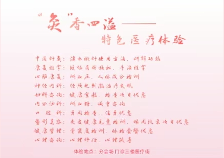 撳針美容、肩頸推拿、測血壓、人體成分檢測、經(jīng)顱電刺激治療失眠、婦科健康宣教、測血糖、減重咨詢、牙周檢查、頭皮健康毛囊檢測、骨密度檢測、心理咨詢。