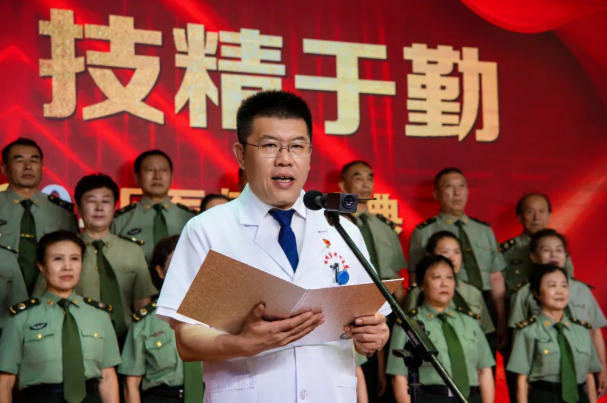 市委副秘書長(兼)、市衛(wèi)健委黨組書記、主任胡占升身著白大衣、佩戴胸卡登臺,以醫(yī)者的身份親切寄語,勉勵全體醫(yī)師繼續(xù)以仁心仁術守護人民健康。